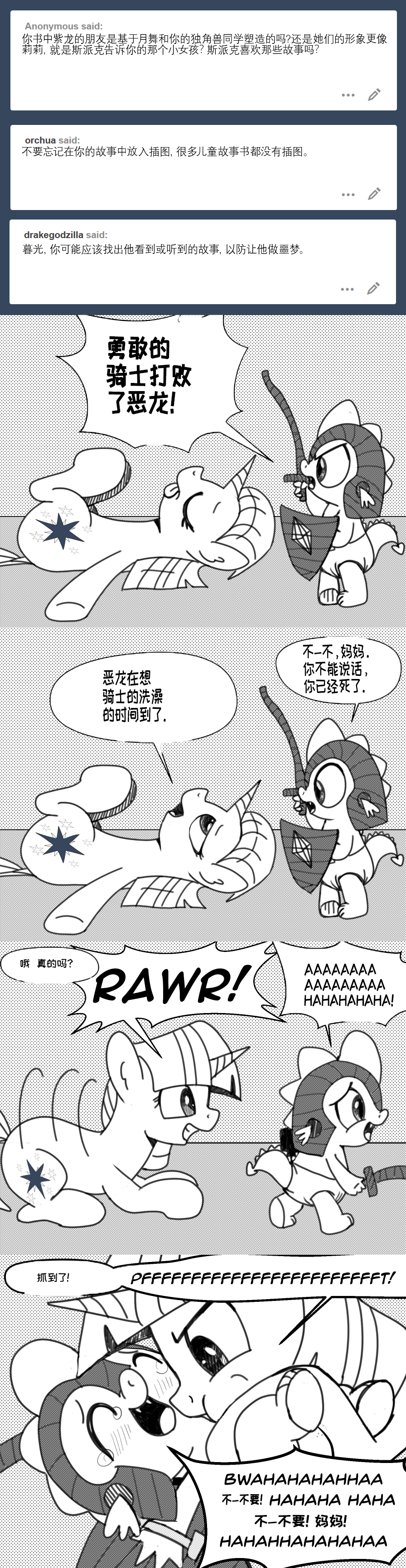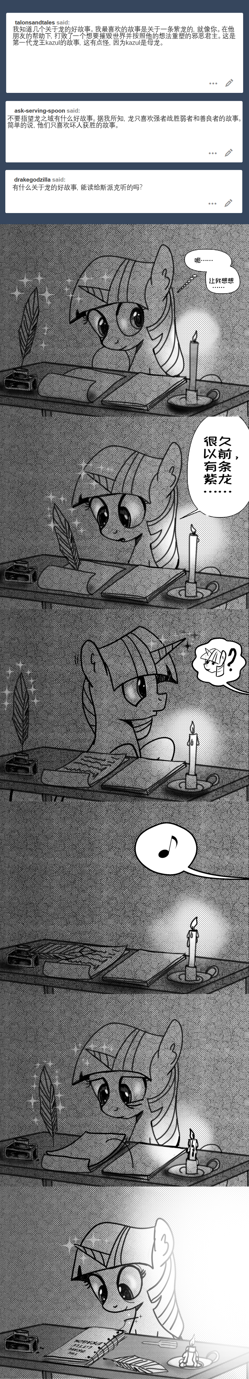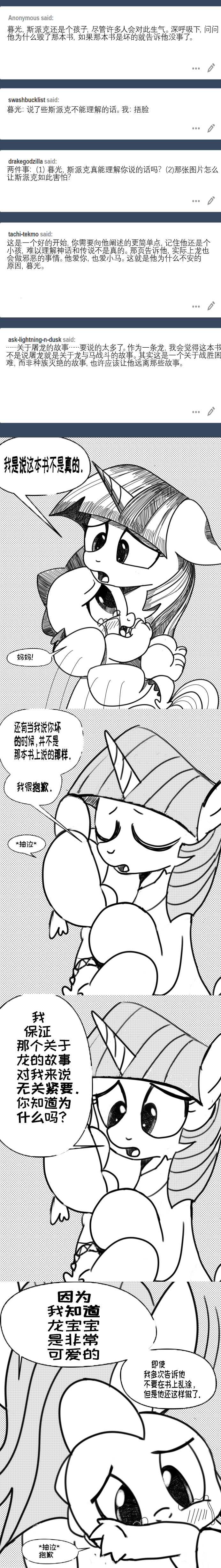 暮光:那天晚上,我给他写了一个关于勇敢的小龙的故事,他和他的小马朋友们进行了许多冒险。