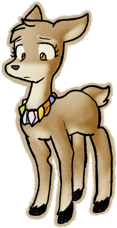 其中一匹雌鹿似乎没有其他雌鹿那么胆小。她的穿着也似乎不一样——她的脖子上挂着许多东西。她没有鬃毛,没有背心,只有一个石头项链。那是半宝石状的闪闪发光的宝石,像是石英或者其他美丽但毫无价值的宝石品种。她张开嘴,结结巴巴地说道:”你……只是一头小鹿……却能把天猫(skycat,指狮鹫)给杀了。”