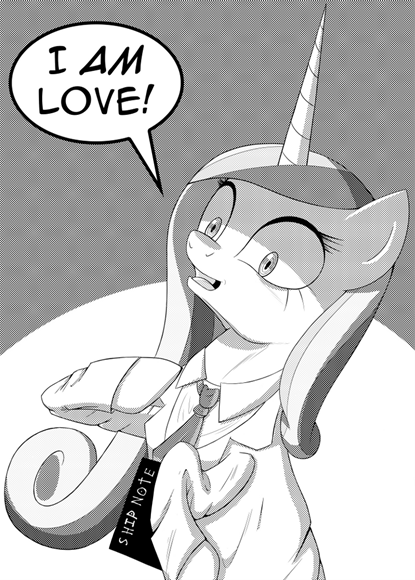 “我是韵律,爱之公主,阿莫拉·卡丹莎公主。”她吐出冷傲的字句。“我即是爱。我决定哪些小马相爱......哪些不行。” 她咬牙切齿地挤最后一个字,好像啐出了什么脏嘴的字眼。
