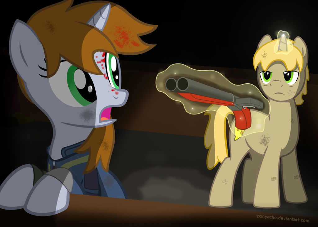 “嘿,瞧见没!这小妞儿自己就乖乖走了过来,不是吗?”一只壮硕的陆马从附近一块岩石的阴影中走了出来。他的蹄子上钉着带刺蹄铁,踏在岩石上便发出清脆的金属音。还有两只小马从另一边的藏匿处悄声走了出来——一只也是陆马,衔着一把边缘被磨尖的致命工兵铲;另一只是独角兽,他的角发着微光,对着我举起了一截短粗的东西,那东西用木头和铁做的,有两根管子。每只小马都穿着用厚实的兽皮制成的护甲。除了书上的插图,我以前从没见过任何枪械,就像我没经历过真正的夜晚一样。但即使这样,我也相当清楚地意识到那是个致命的威胁。