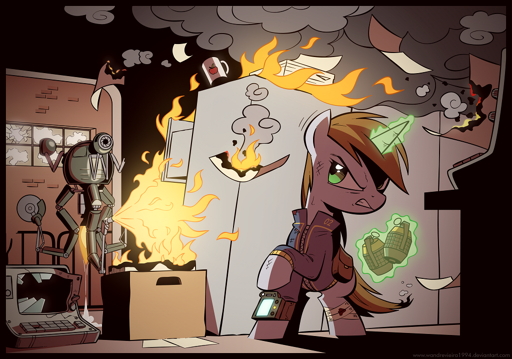 我从鞍包里摸出两颗蹄雷,等待着烈焰平息。炽热的档案柜炙烤着我的腰背,滚烫的空气灼伤了我的双肺。在机器马停止喷火的一瞬间,我马上从柜角探出头,将蹄雷扔向那个金属怪物,并在半空拔出拉环。它一看见我就举起了一把发绿光的武器,形状好似独角兽的角。一团可怕的火球下一刻就从我身边掠过,我感到脸颊一阵灼痛。绿色的火球击中了我身后桌子上的一个旧风扇,它一下子泛起绿光,然后融化掉了!眼看蹄雷就要爆炸,我赶紧又缩回柜子后面。