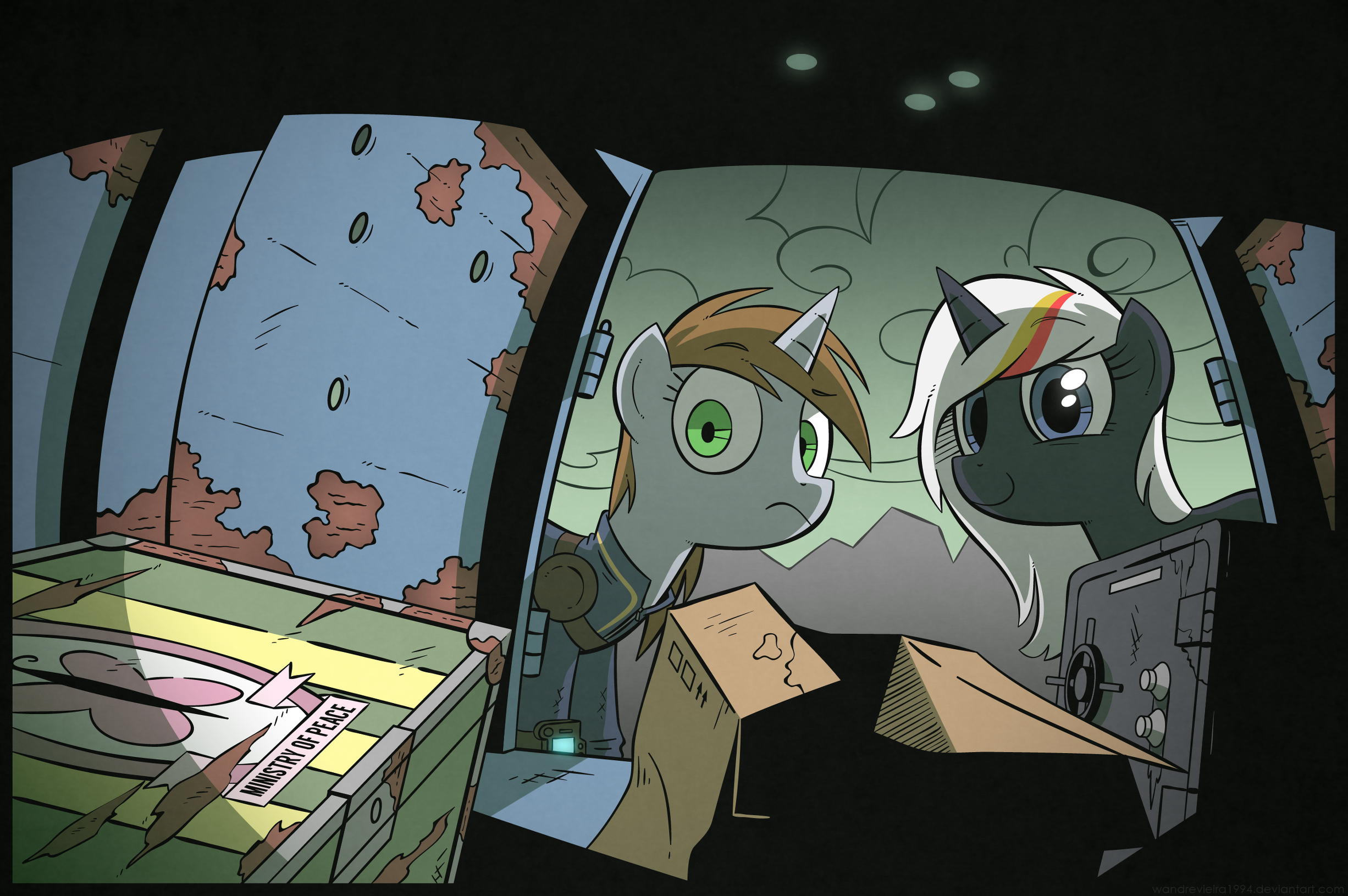 保险箱上的锁几乎没费什么力。从周围被洗劫的场景来看,我很惊讶这种低难度的锁竟然这么久都没被其他拾荒者撬开过。或者我是外面世界里唯一会这种技能的小马?想到这里,我拉开了保险箱。