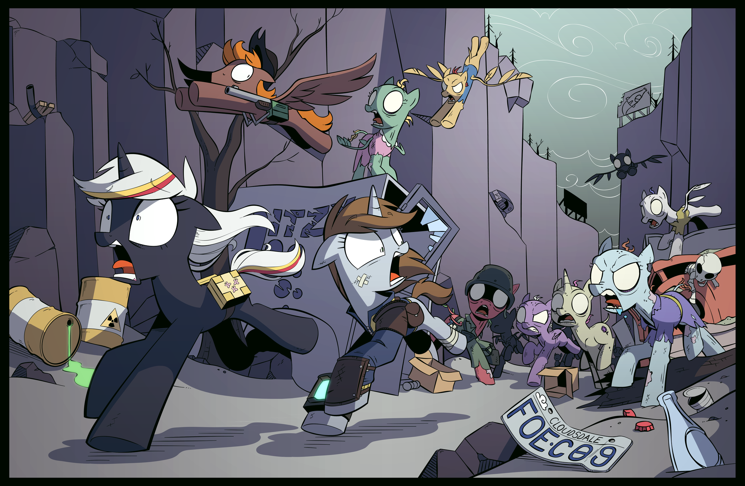 连绵的山脉耸立在山谷的另一边。病怏怏的草地遍布着发黑的枯木。一些新生的植株簇拥在周围,依靠它们的残骸作为养料而蓬勃生长,前上方则是一个老旧褪色的巨大广告牌,因磨损而变得模糊——上面印着一只兴奋到极点的粉鬃黄色小马,正高高举着一瓶闪闪可乐。你可以不费吹灰之力瞬间认出那种饮料,哪怕广告牌上的文字已经褪到了无法阅读的程度。据灾厄所说,那些巨大的牌子叫户外看板,曾经遍布云中城和其他城市之间的交通航道中,推销着全小马国的商品与服务。不仅如此,我甚至能望见半里外山谷另一侧的第二个广告牌。即使在这样的距离,我也能在脑内补出广告牌上熟悉的画面:一只英雄一样的虹色天马携带虹色冲击波越过天空,掠过下方邪恶的斑马军队。牌子下方写着:毛色须纯,击溃斑纹。