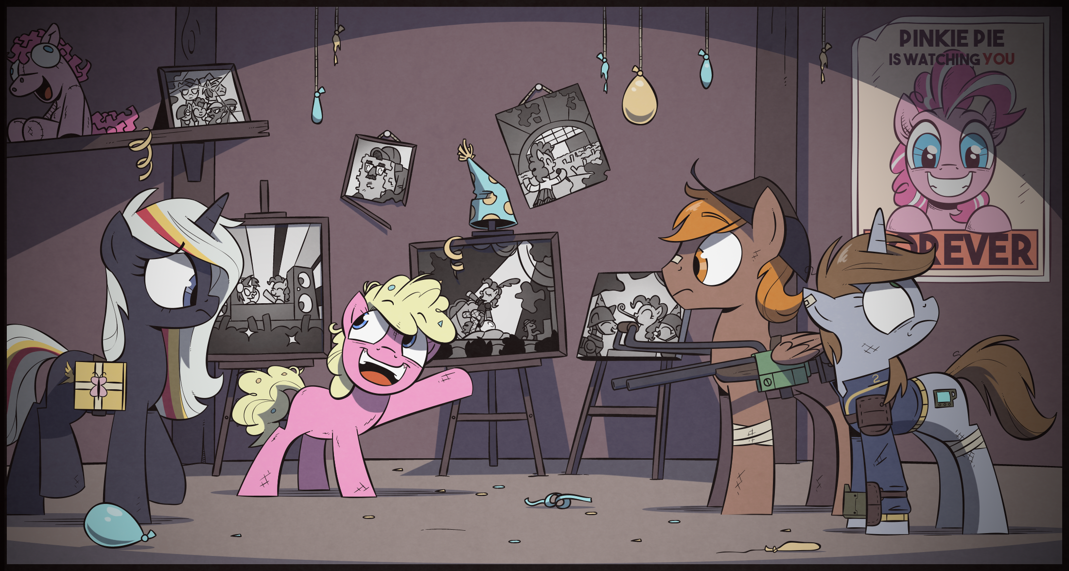 “在战争的头几年,萍琪派到处旅行,为即将上战场的小马国军队办派对!带给他们家乡的味道,最重要的是,振奋他们的精神,让他们的脸上挂满笑容!”萍琪贝儿朝着几幅装在相框里的萍琪派照片挥了挥蹄,照片里的萍琪派穿着带花边和网眼的服装,面对近千小马,在舞台上跳舞。“她没有执行塞拉斯蒂娅公主的超级机密任务的时候,就是这样!”