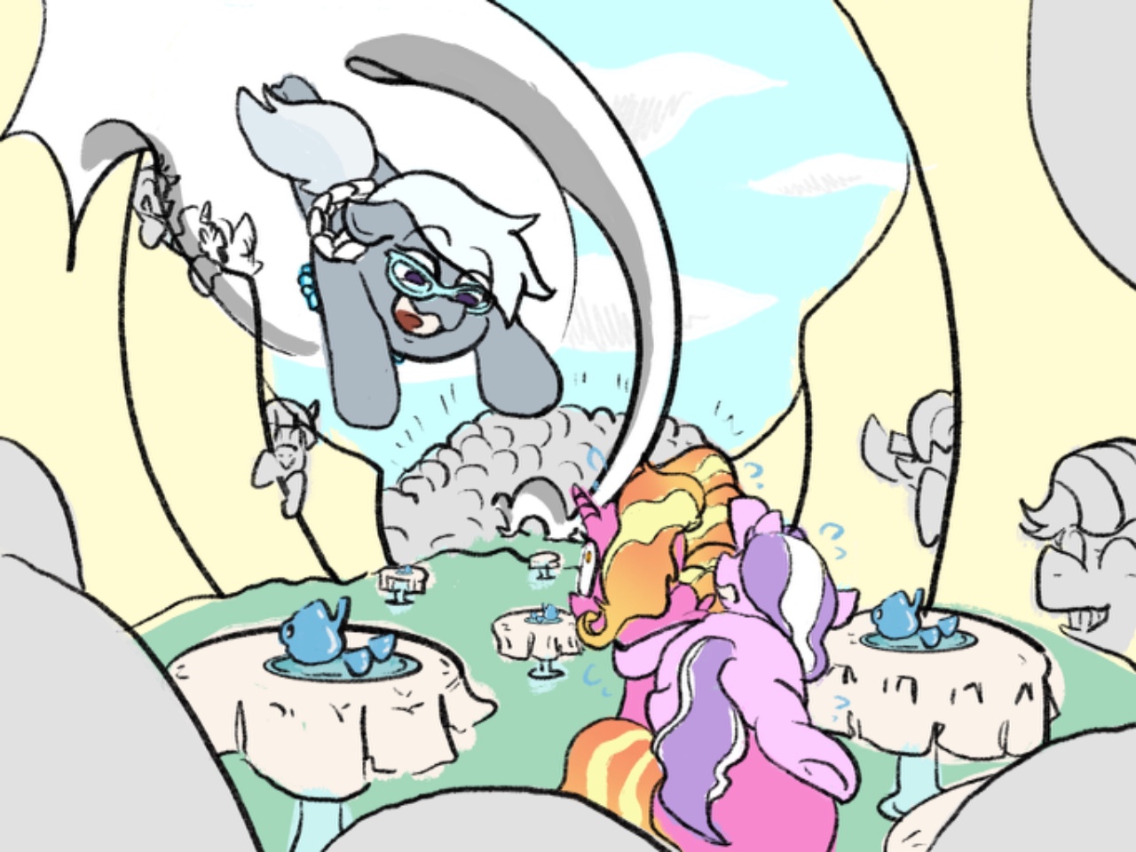 当所有小马都落位开始品尝他们的下午茶后,粉色的那匹派对小马叫道,而灰色的那匹无聊地吹着口哨,目光飘向天空。“你不能每一次都拉着新来的小马就地开派对。我们需要的是惊喜,惊喜!我们应该准备上一大堆蛋糕,果酒和小游戏,然后躲在他们的家里、旅馆里、他们所有的必经之路上狠狠地吓他们一大跳!”