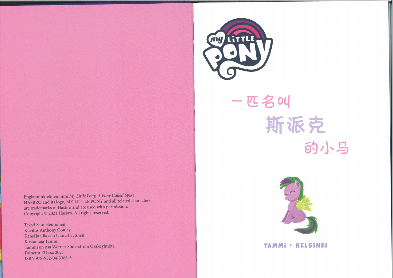 从EQCN之前发布的一篇资讯那也介绍过(新官方图书《名为斯派克的小马》已在芬兰出版 | EquestriaCN),去年11月刚刚发行的本书全篇语言都是芬兰语,无论阅读难度还是翻译难度都是暴增。