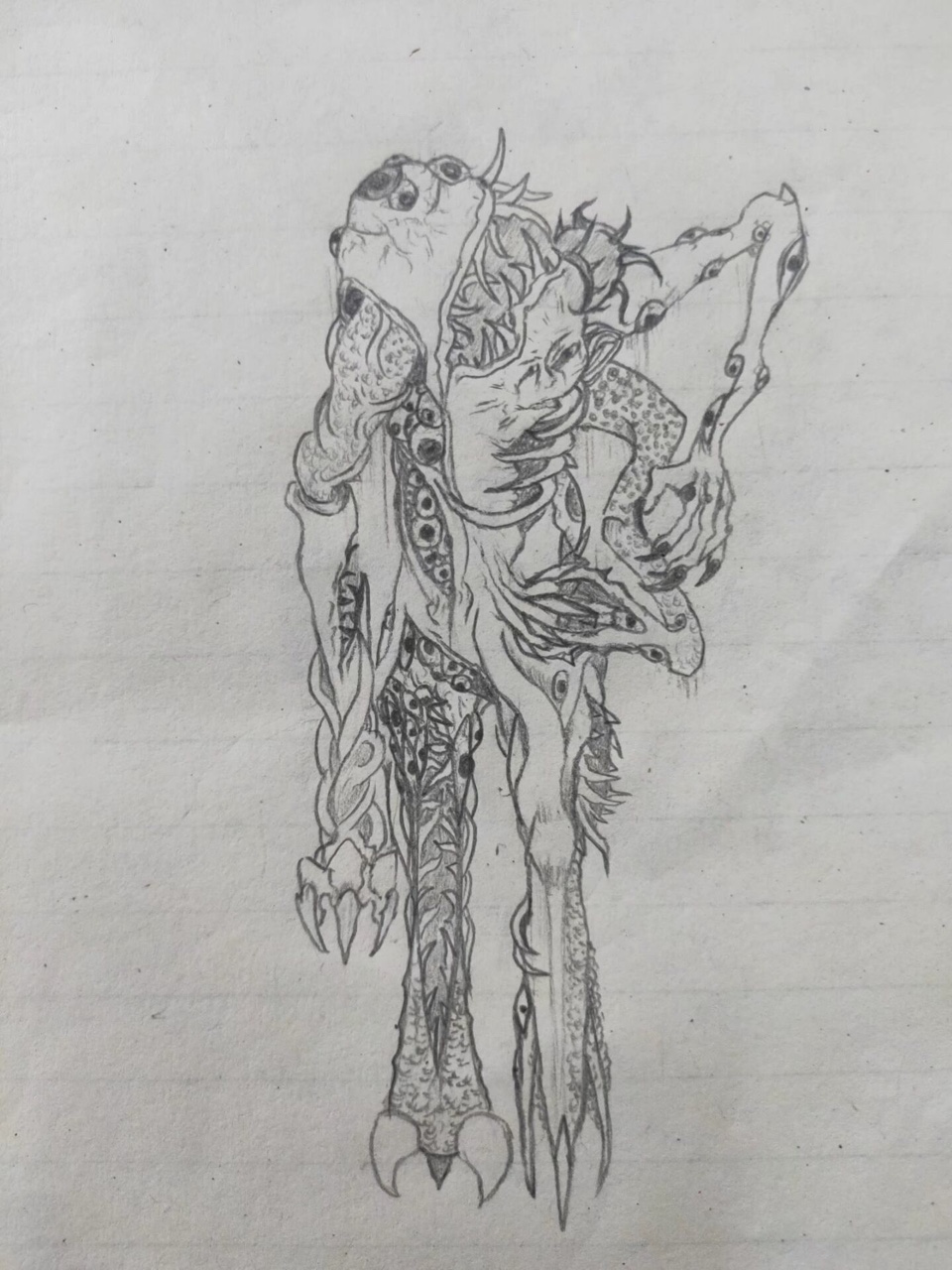 至于它的其余部位,皮肤、眼睛、肌肉组织、外骨骼相互交替,粗大的血管像常春藤般绕在它的身体上,反复跳动着来代表它是活的。头顶有一个斜着咧开成三瓣的巨口,里面排满了凌乱无序的尖牙,有的甚至都伸到了嘴外面;头的顶端有一个盘子大的眼睛,瞳孔是血红色的,此刻正带着其他眼睛一起死盯着余晖一众。它的腰侧还接有一条似乎是蛇的身体变成的手臂,此时正在和蛇一样四下摆动着。