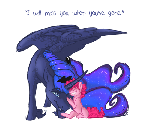 暮光消失了,而露娜认出了那个声音,霎时恐惧到了极点。她咽了一口唾沫,然后强迫自己转过身来,面向了萍琪派,后者正一脸好奇地抬头看着她。